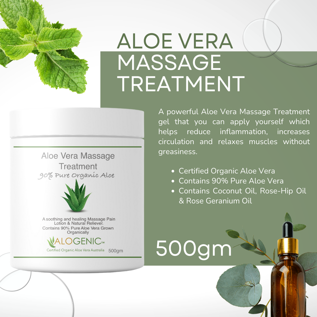 Our natural Aloe Vera Massage Treatment is a powerful Aloe Vera massage treatment gel that you can apply yourself which helps reduce inflammation, increases circulation and relaxes muscles, without the greasiness.