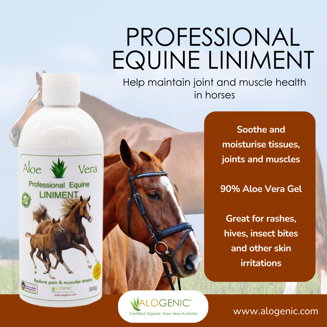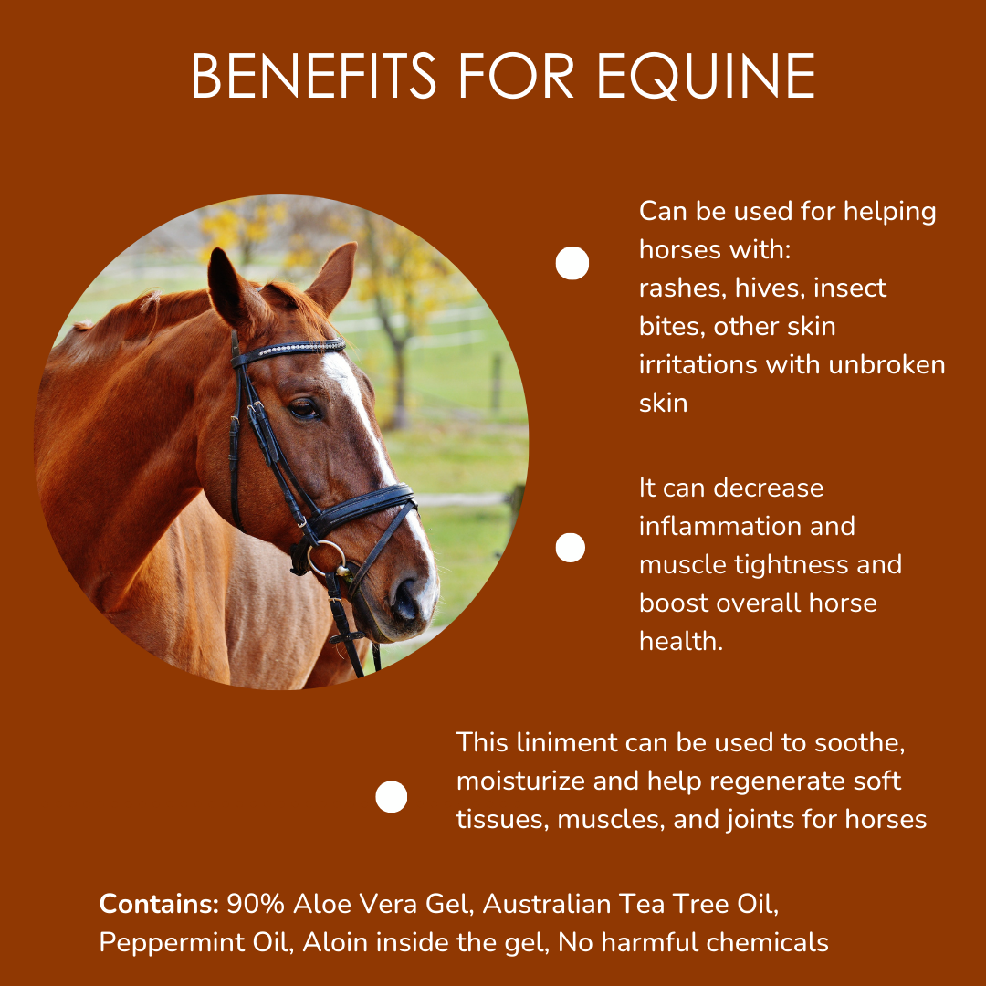 Aloe Vera Liniment for Equine is a specialised liniment made with Aloe Vera, a herb known for its healing properties. This liniment can be used to soothe, moisturise and help regenerate soft tissues, muscles, and joints for horses. It can also decrease inflammation and muscle tightness and boost overall horse health.